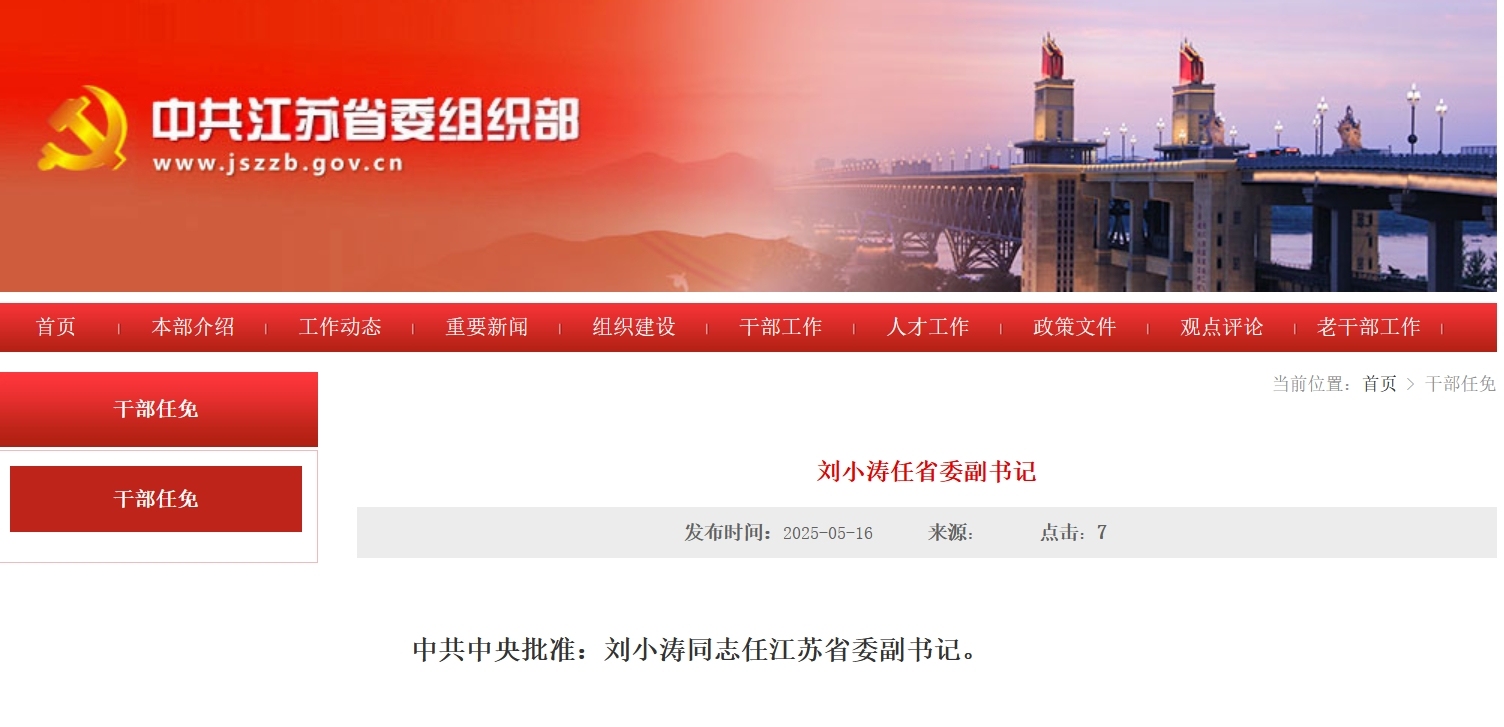 中共中央批准:刘小涛同志任江苏省委副书记。